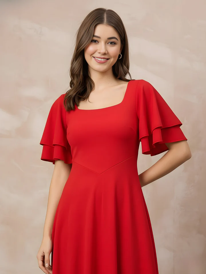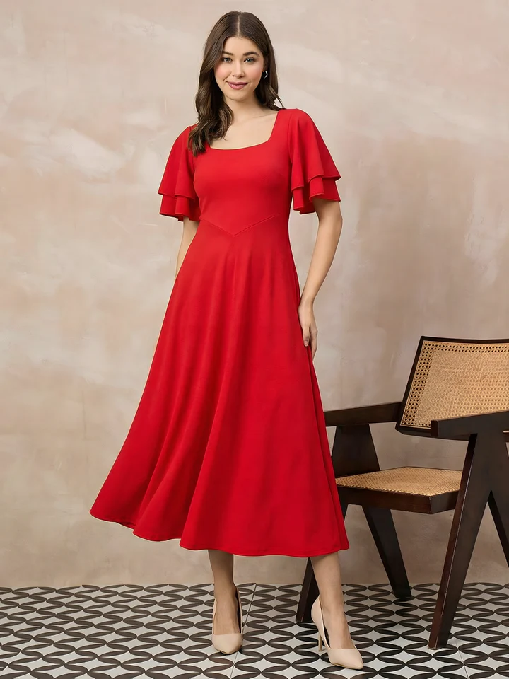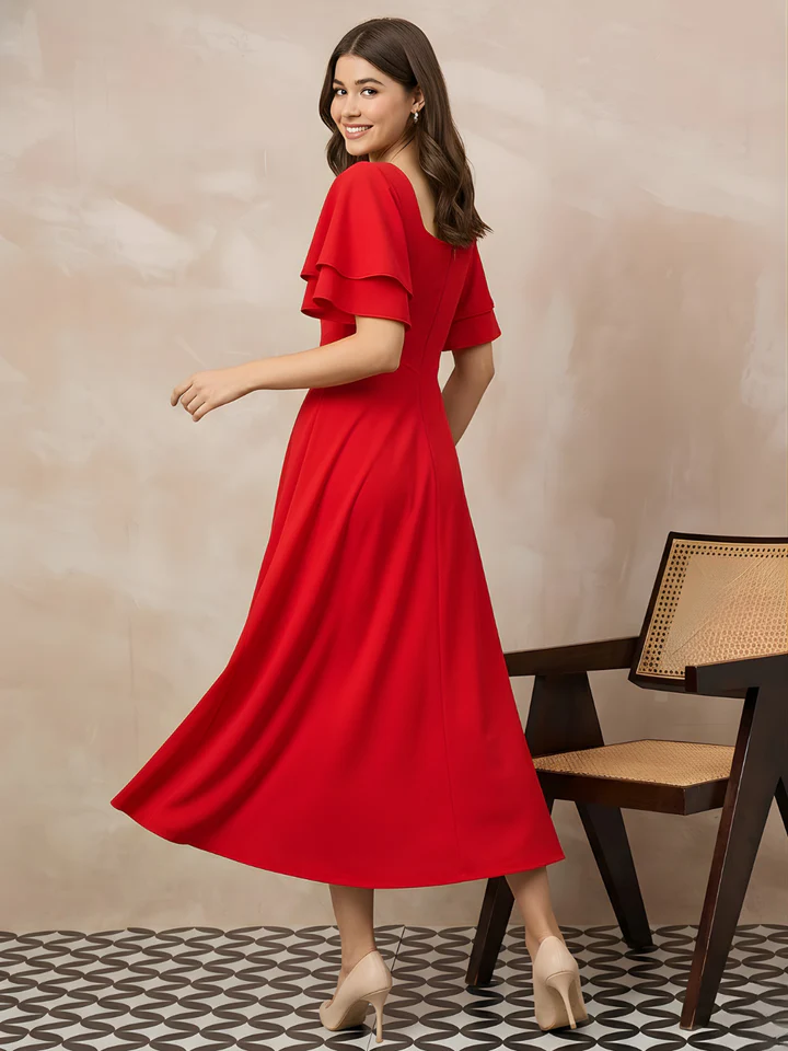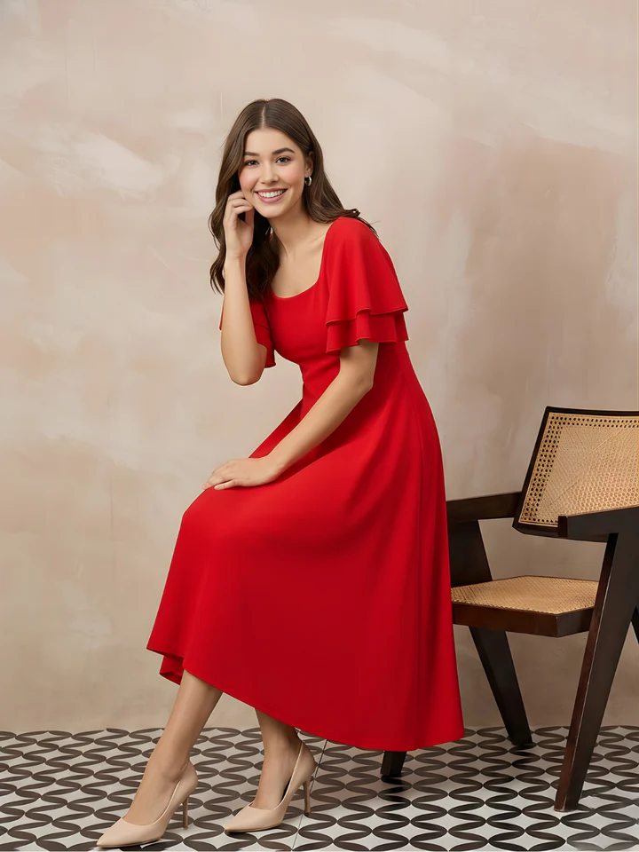 Make a bold yet elegant statement with this stunning red midi dress designed to highlight confidence and charm. The soft flare silhouette creates a flattering shape while the layered sleeves add graceful movement.