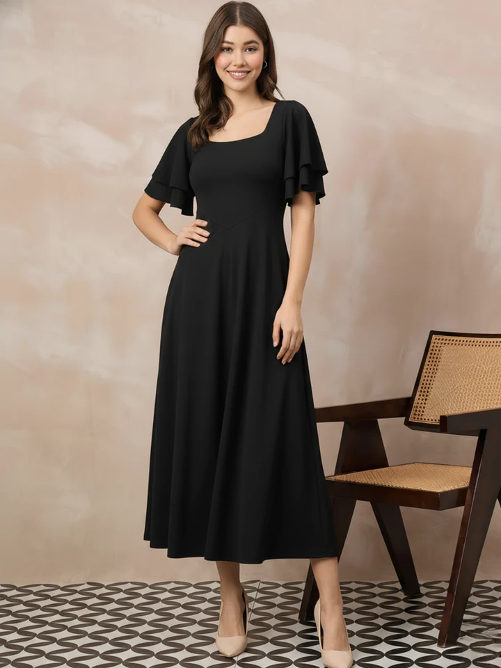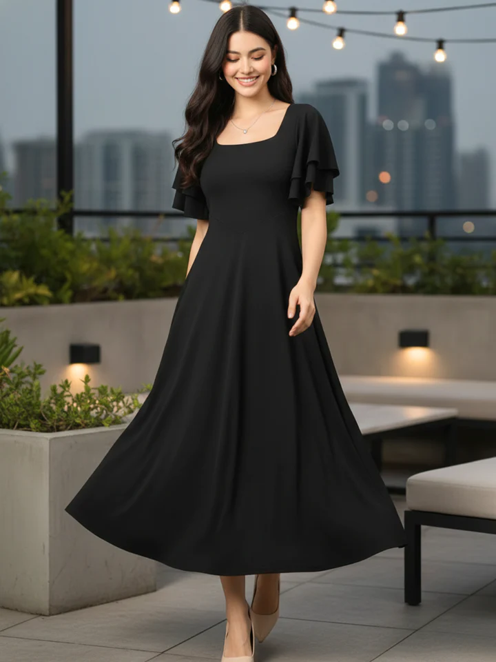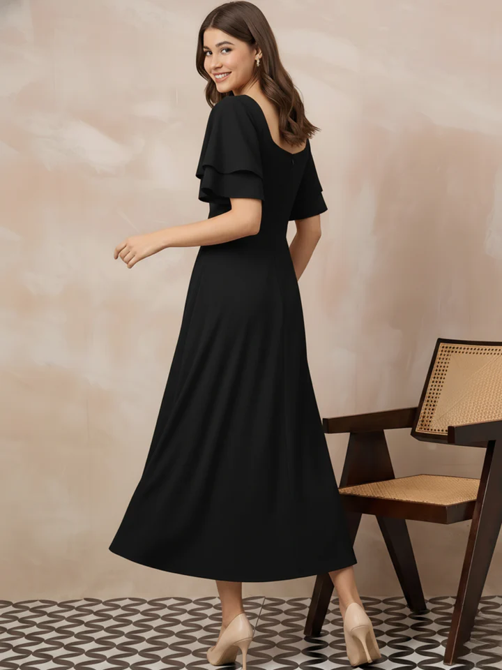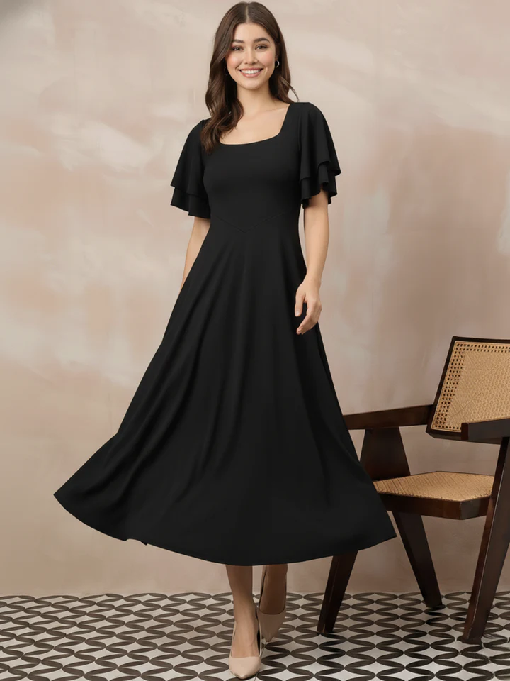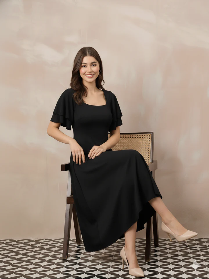 A timeless black midi dress with soft flare and elegant sleeves, perfect for dinners, parties and formal outings.